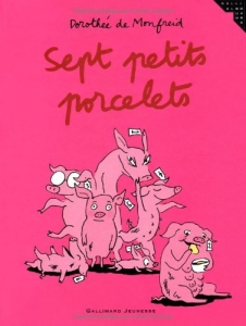 Avec Sept petits porcelets, Dorothée de Monfreid revisite en l'histoire du Petit Poucet en même temps qu'une analyse rigolote sur les familles modernes et nombreuses. Que ce soit du côté des parents, toujours stressés et énervés, ou des enfants, qui bougent tout le temps mais qui sont incompris de leurs parents, Dorothée brosse un portrait dans lequel il est difficile de ne pas se retrouver, au moins un peu. C'est finement fait, même si parfois les noms d'oiseau fusent aux oreilles chastes (oui, je sais, je rêve) de nos enfants.