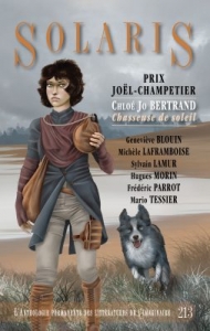 Le volet Fictions commence, logiquement, par la nouvelle lauréate du Prix Joël-Champetier, justement. Il s'agit de Chasseuse de soleil, de Chloé Jo Bertrand : après trente ans d'hiver nucléaire, l'humanité, de moins en moins nombreuse, s'est organisée. Certains, comme Sud, voyagent pour enregistrer les détails des rares apparitions du Soleil. Une autre histoire de "road trip" dans un univers post-cataclysme pour la jeune auteure de Apocalypse Blues. Comme ceux de cette trilogie, les personnages et l'univers sont crédibles, et le format, court ici, est bien maîtrisé. En somme un texte intéressant d'une plume à suivre.