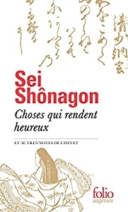 Choses qui rendent heureux et autres notes de chevet rassemble, comme son nom l’indiquent, des notes sur un ensemble de thématiques, qu’elles rendent heureuses, qu’elles émeuvent ou encore qu’elles énervent. Rédigées ou compilées par Sei Shônagon, dame d’honneur de l’impératrice Teishi au tournant du premier millénaire de notre ère, chacune de ces listes est relativement courte. L’ouvrage n’en présente pas l’intégralité mais une sélection de morceaux choisis, et accessibles à petits prix ; une version plus complète, Notes de chevet, existe aux éditions Gallimard.