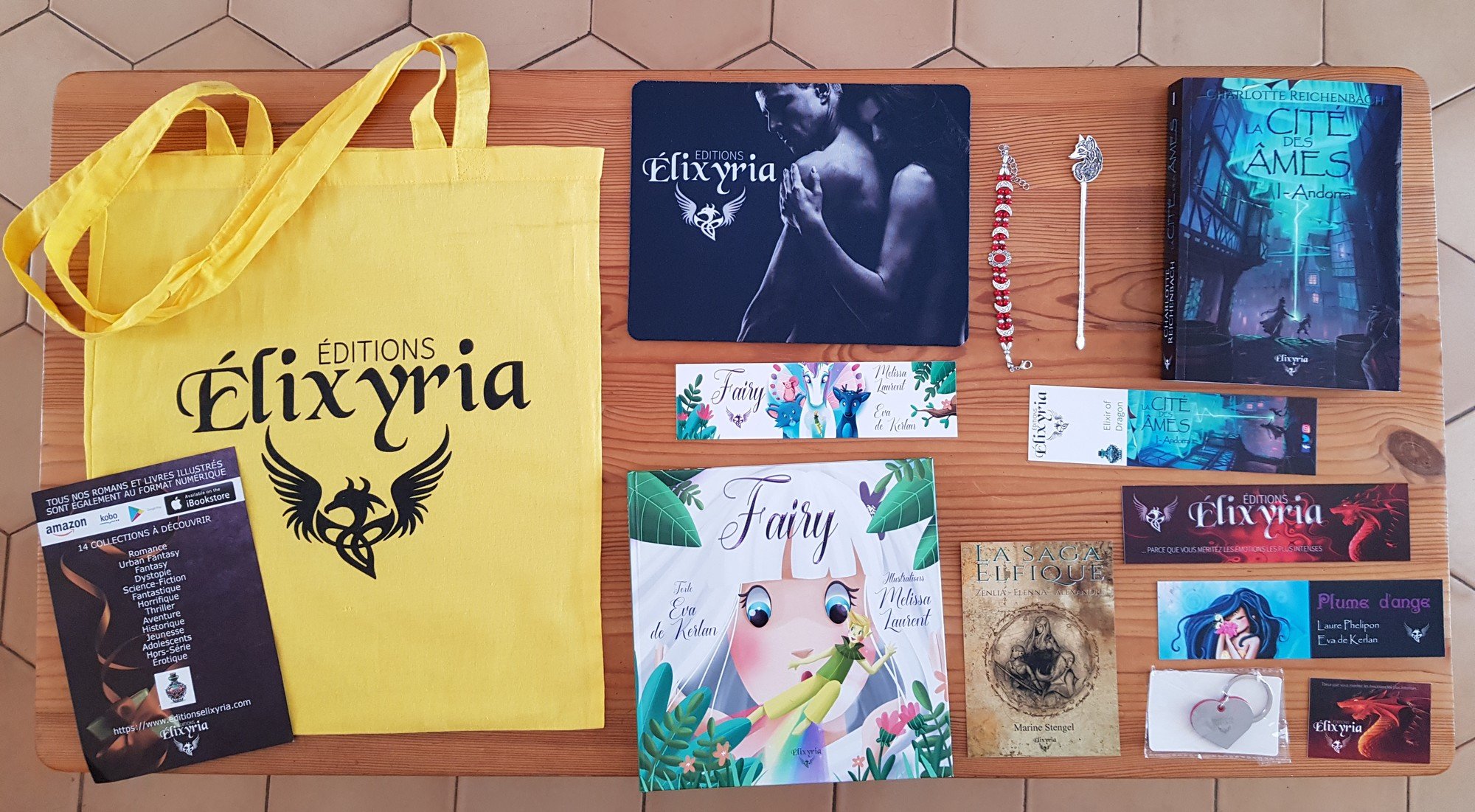 On a acheté deux ouvrages aux Editions Elixyria lors du salon Romance Addict de Vendargues un peu plus tôt ce mois-ci, et on a vraiment été gâtés niveau goodies ! Tote-bag, marque-pages, tapis de souris, bracelet, porte-clé... (C'est ma fille qui était super ravie !)