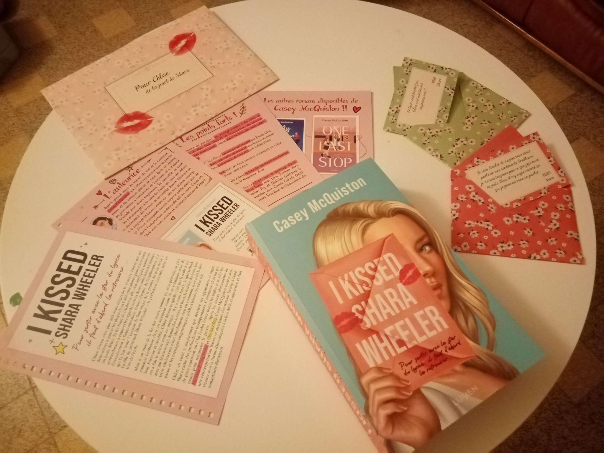 En tout cas, I kissed Shara Wheeler est une romance plaisante à lire, avec des personnages attachants et une enquête palpitante ! Elle plaira aux jeunes lecteurs en quête de sensations fortes et qui aiment le microcosme un peu glauque des lycées américains. Avec le livre, Lumen m'a fait parvenir de petits enveloppes colorées aux motifs fleuris, similaires à celles utilisées par Shara durant le récit et qui comportent même des mots de la jeune fille, un bon moyen de se plonger encore plus dans l'ambiance !