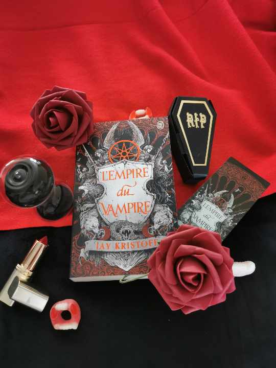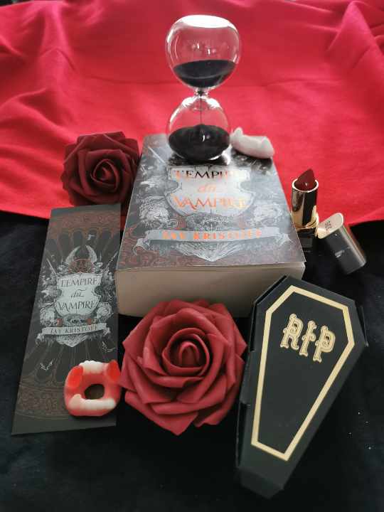 A noter que j’ai reçu un kit presse très sympa avec le livre ! Des roses (rouges, évidemment), un rouge à lèvre, un cercueil en carton qui contenait des bonbons en forme de crocs de vampire, un marque page et ainsi qu’un sablier au sable noir, très décoratif. Et un petit mot me souhaitant bonne lecture à l’intérieur du colis, j’avoue que je me suis sentie gâtée.