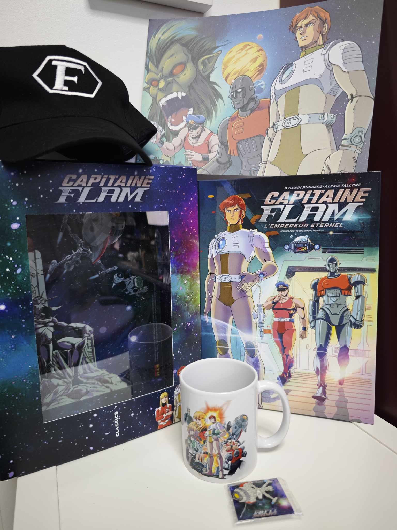 J’ai reçu cette BD en avant-première dans un très beau coffret qui comprenait, outre la BD, une casquette siglée du Capitaine Flam, un pins du Cosmolab (je rêvais de ce vaisseau quand j’étais petite !), une tasse sérigraphiée avec toute l’équipe, et une lithographie. Le fond de la boîte transparente étant amovible, il se transforme en seconde lithographie avec l’Empereur Eternel. Pour accompagner l’ensemble, un dossier de présentation avec une interview des auteurs, la genèse de cet album et quelques croquis préparatoires. C’est vraiment un très beau coffret, bien travaillé et j’ai adoré le recevoir et l’ouvrir, comme un petit Noël avant l’heure !
