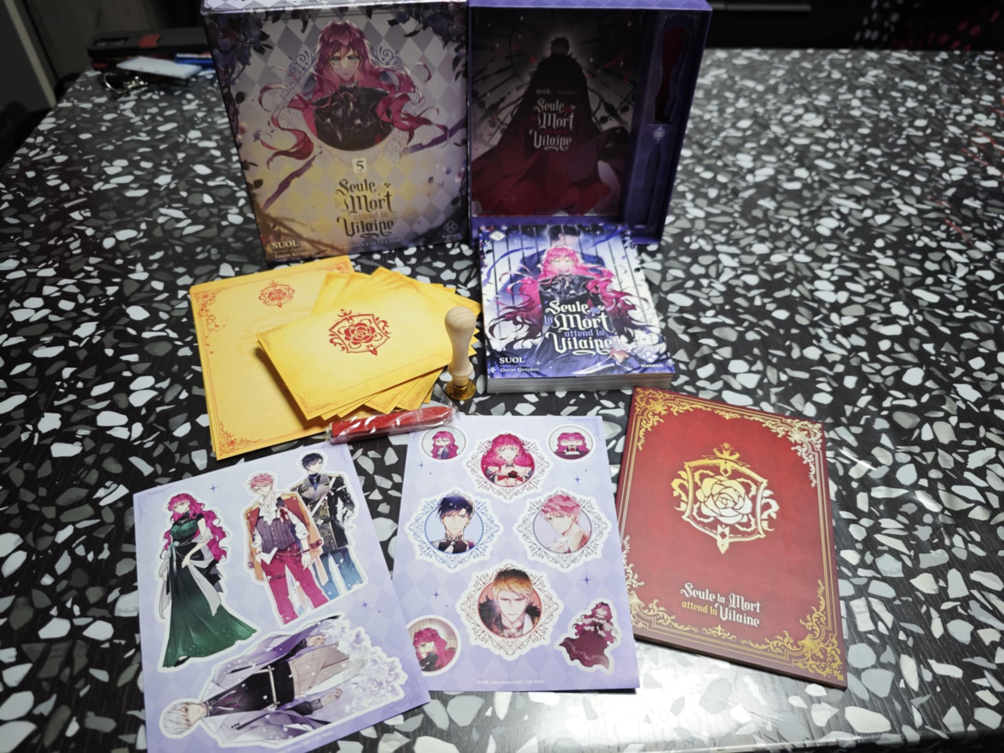 Ce cinquième tome bénéficie d’une très belle édition collector que j’ai eu la chance de recevoir. Dans un coffret joliment décoré, on retrouve, outre le webtoon en format papier, un nécessaire à correspondance qui comprends du papier à lettre, des enveloppes, un sceau et de la cire à cacheter. Sans compter un carnet (je vous ai déjà parlé de ma passion pour les carnets ?), et deux planches de stickers avec les personnages principaux de l’histoire.